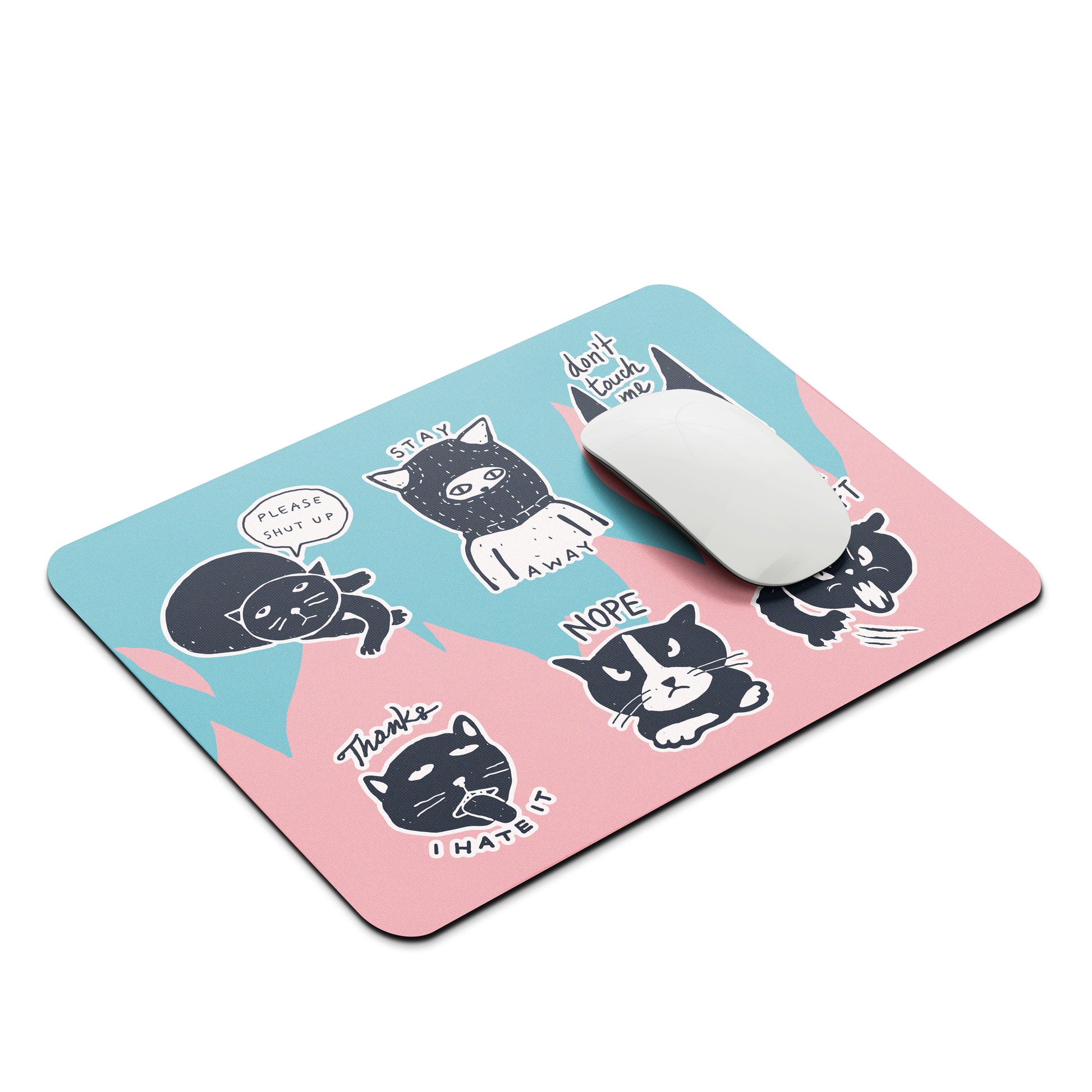 פד לעכבר שישקף את מה שבאמת עובר לכם בראש. אוסף של איורים בסגנון סטיקרים, כל אחד מציג חתול כעוס ושלילי שאומר בדיוק את מה שאתם חושבים, אבל לא מעזים לבטא בקול רם במשרד.
