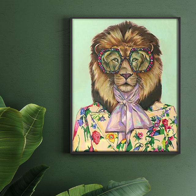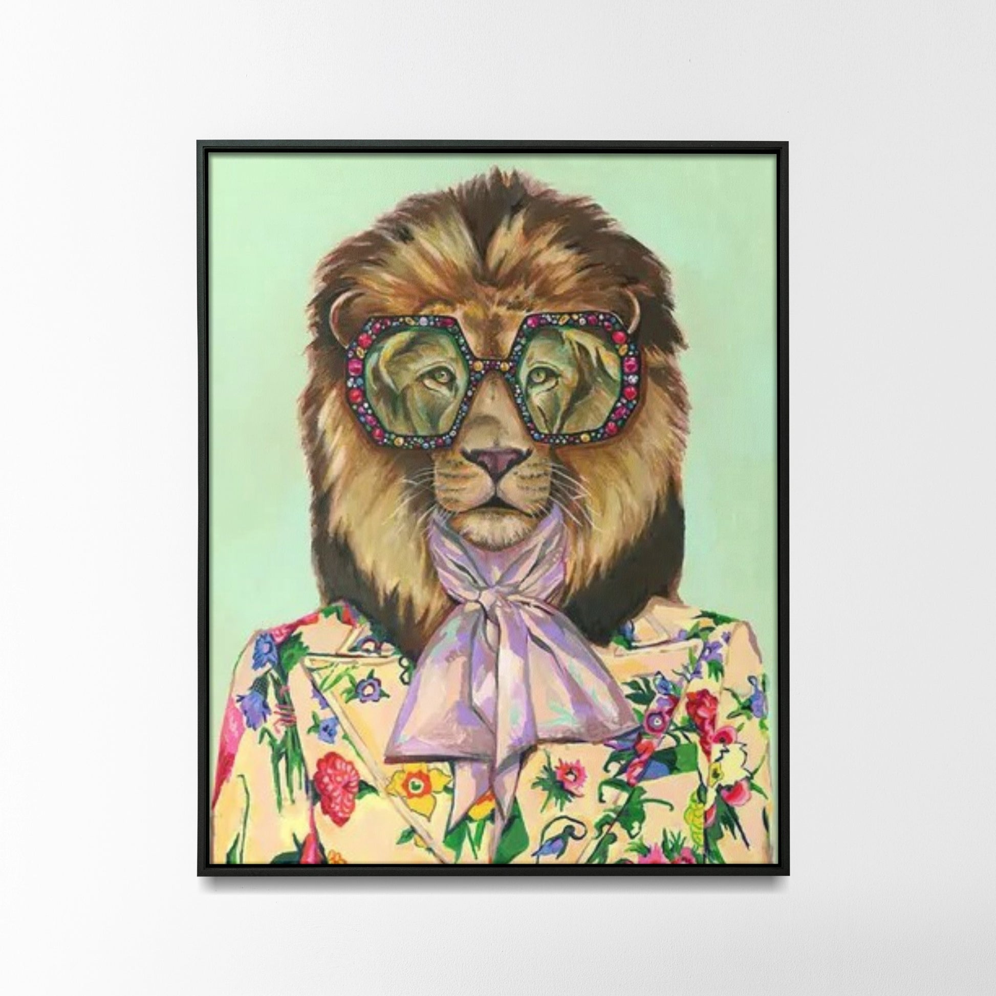 פוסטר מסדרת "חיות עם סטייל" של בסטיז פרינטס. פוסטר גדול, איכותי עם הדפס של אריה, לבוש בחליפה פרחונית "צעקנית" וצעיף בהיר על רקע ירקרק.