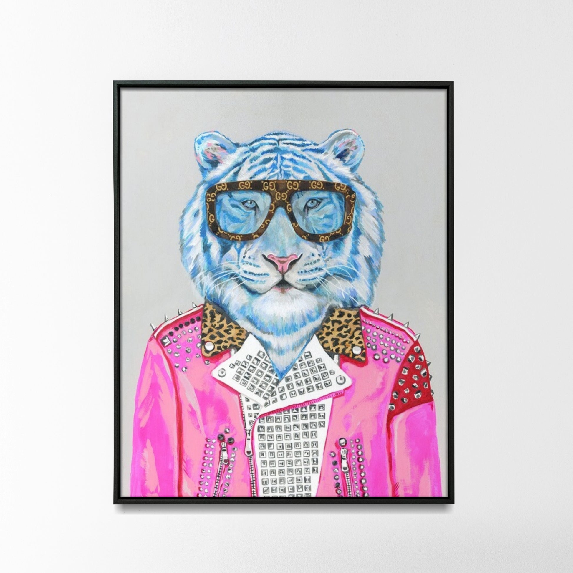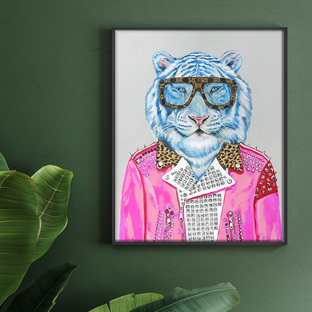 פוסטר מסדרת "חיות עם סטייל" של בסטיז פרינטס, עם טיגריס כחלחל לבוש ג'קט ניטים ורוד בוהק ומרכיב משקפיים אופנתיות.