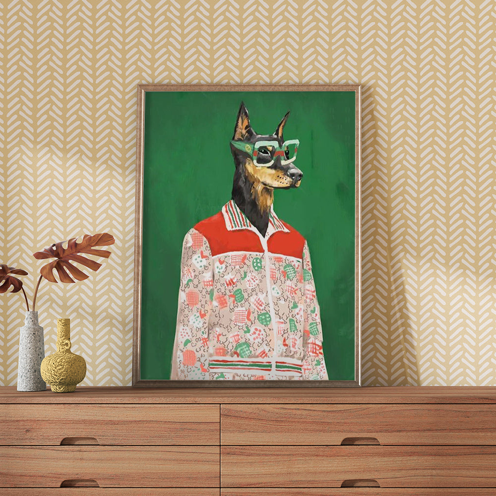 פוסטר מסדרת "חיות עם סטייל" של בסטיז פרינטס. פוסטר גדול, איכותי, עם הדפס של דוברמן לבוש באימונית, על רקע ירוק משגע.
