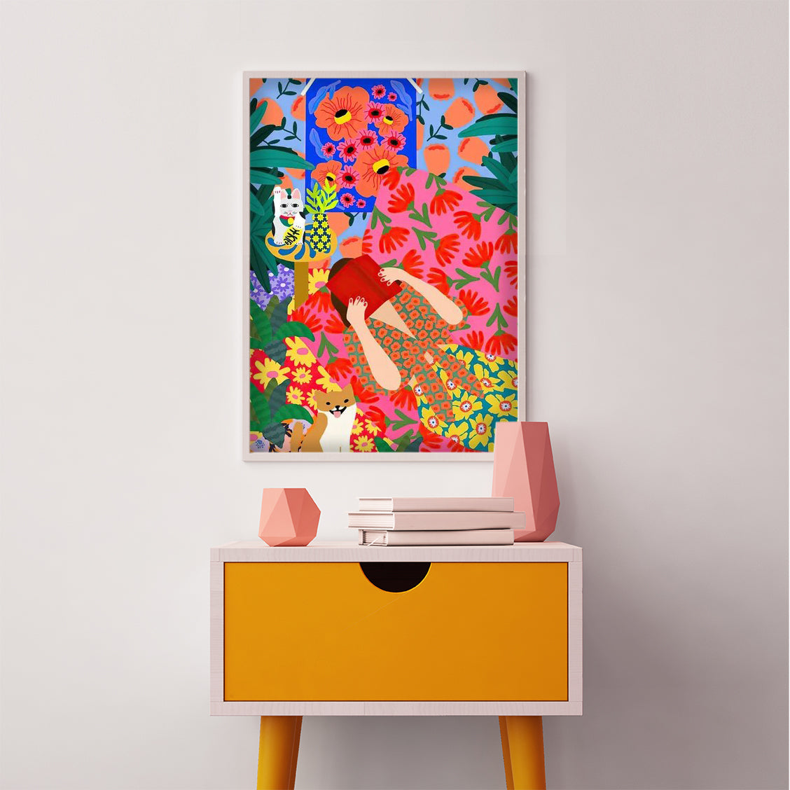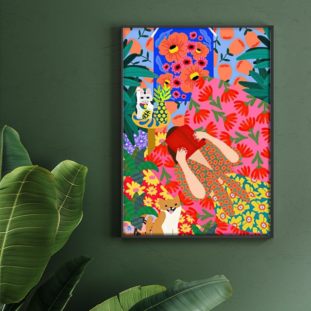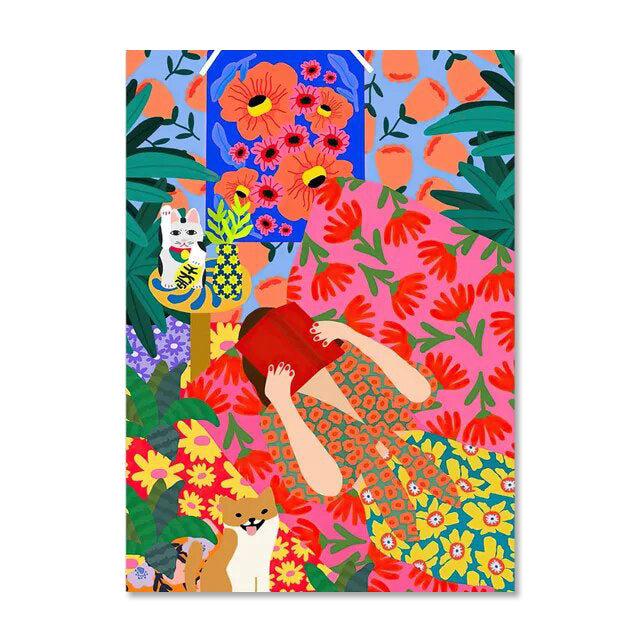 הכניסו קסם וצבע לביתכם עם פוסטר מרהיב ומלא חיים. הפוסטר מציג סצנה ביתית חמימה, אישה שוכבת על ספה פרחונית, קוראת ספר כשלידה כלבה הנאמן.