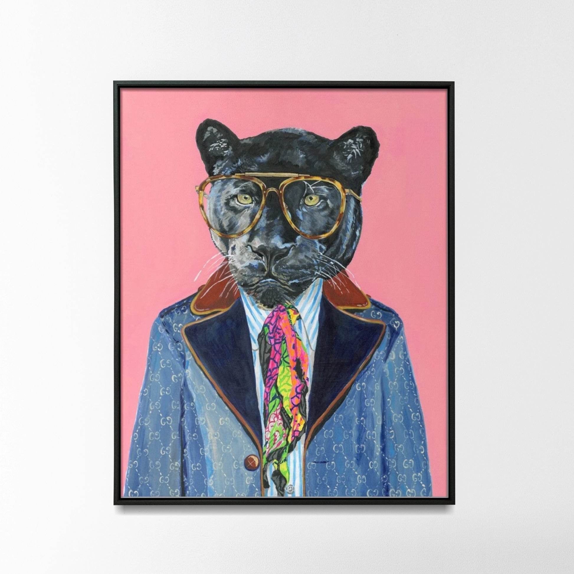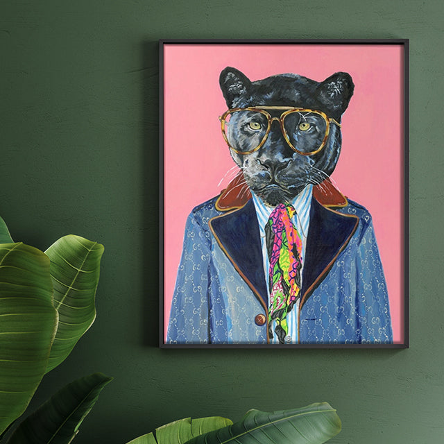 פוסטר מסדרת "חיות עם סטייל" של בסטיז פרינטס. פוסטר איכותי, עם הדפס של פומה יפייפיה, לבוש חליפה אלגנטית ועניבה ייחודית, על רקע ורוד.