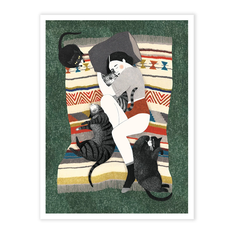 ערכת צביעה לפי מספרים עם תמונה של אישה חובקת חתול על שמיכה צבעונית מוקפת בחתולים. סצנה מקסימה בפלטת צבעים נעימה ורגועה.