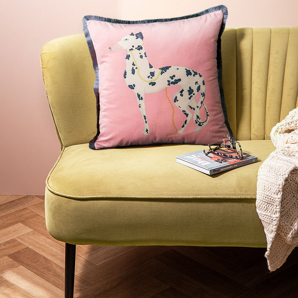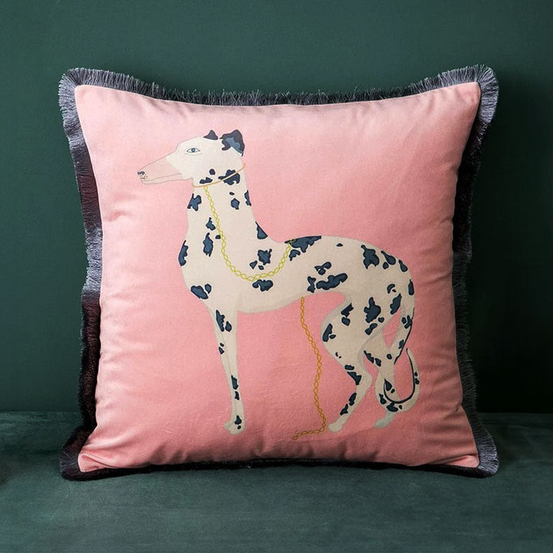 כיסוי רטרו יוקרתי לכרית, מעוטר בגרייהאונד יפייפה. הציפה עשויה מקטיפה עדינה בצבע ורוד ובקצוות עיטורי פרנזים עדינים שמוסיפים לה טאצ' של יוקרה ואלגנטיות.