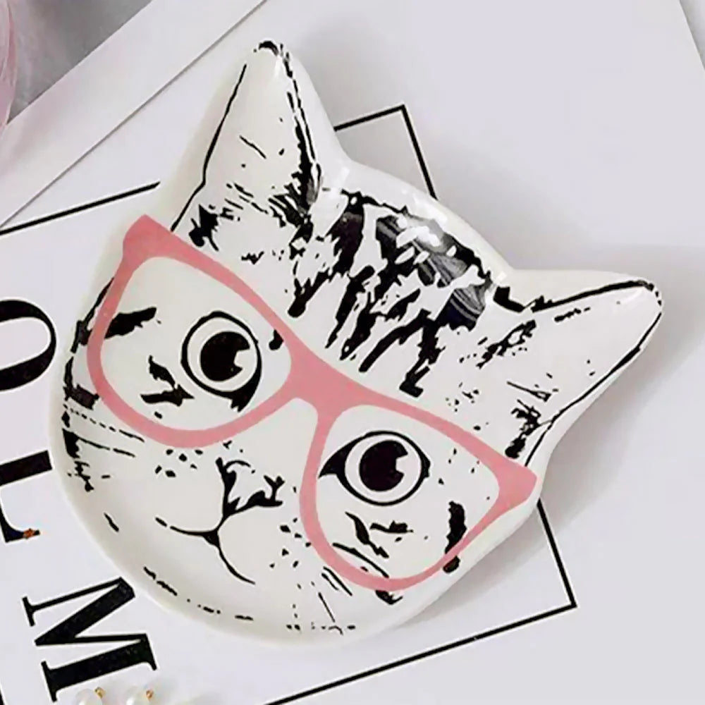 פריט שישדרג את השולחן שלכם ברגע! צלוחית פורצלן איכותית בצורת ראש חתול עם הדפס שחור-לבן בסגנון גרפיטי של חתול חכמולוג מרכיב משקפיים ורודות אופנתיות.