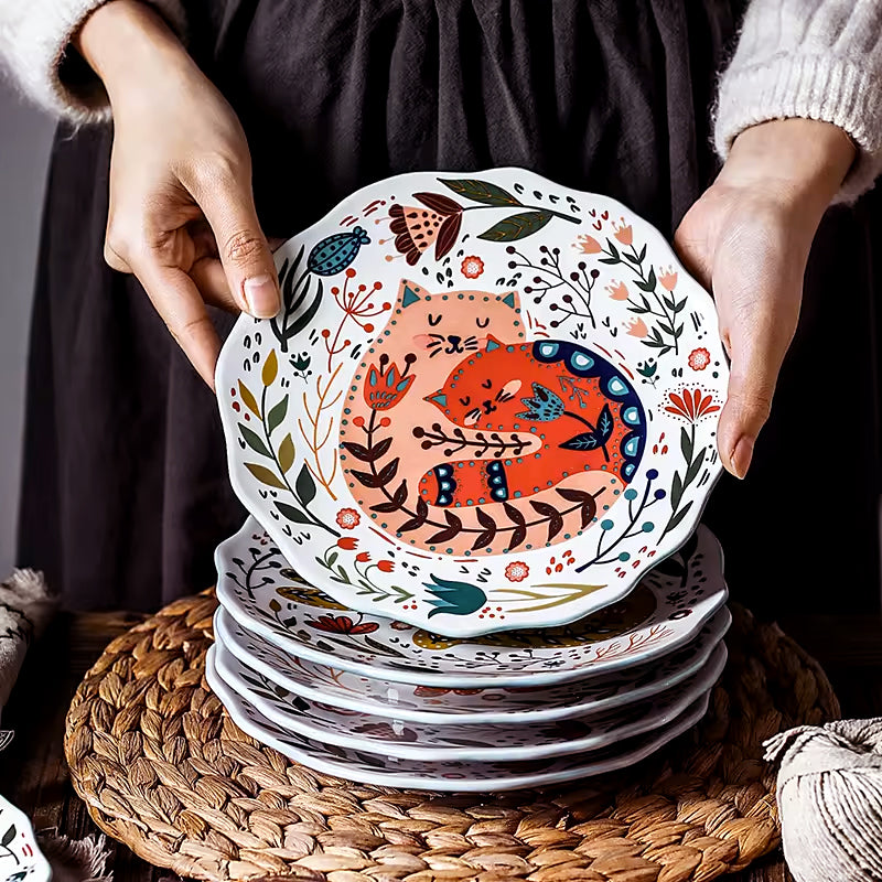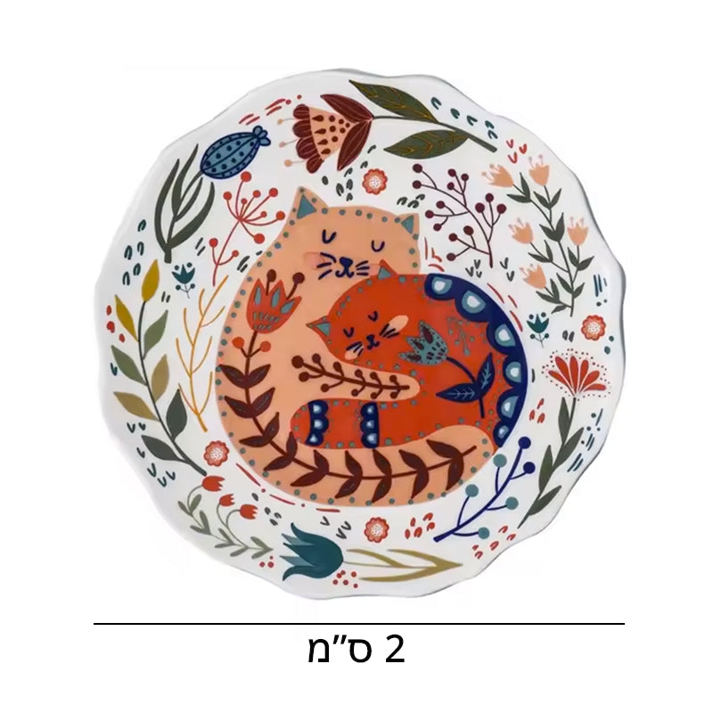 צלחת קרמיקה מקסימה עם איור מתוק של חתולים מחובקים על רקע פרחוני 🌸.