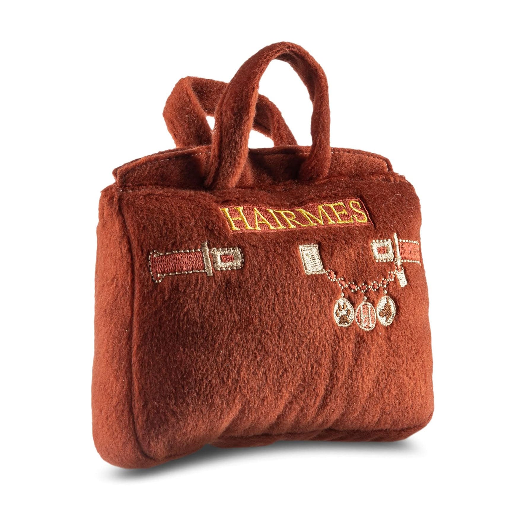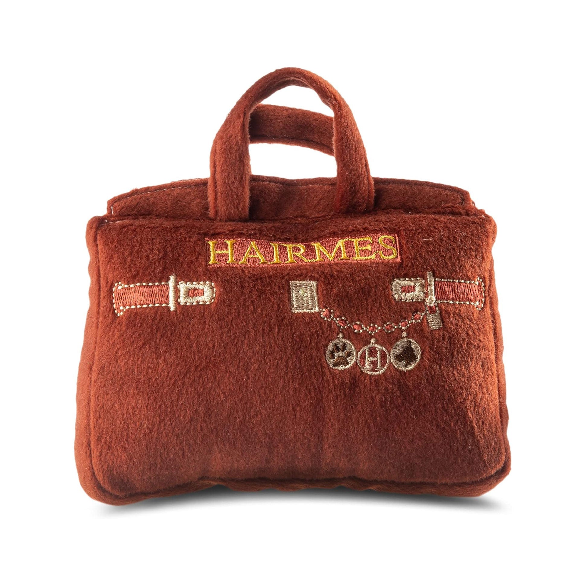 צעצוע פלאפי מצפצף בצורת תיק חום, עם עיטורי רקמה אייקוניים והכיתוב "Hairmes" רקום בחוט מוזהב. ההומאז' המושלם לתיקי היוקרה המפורסמים של הרמס.