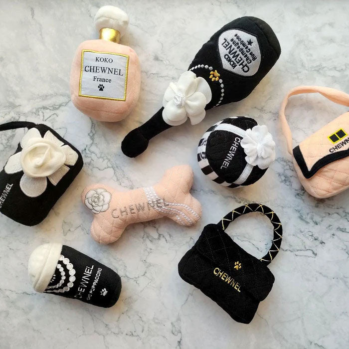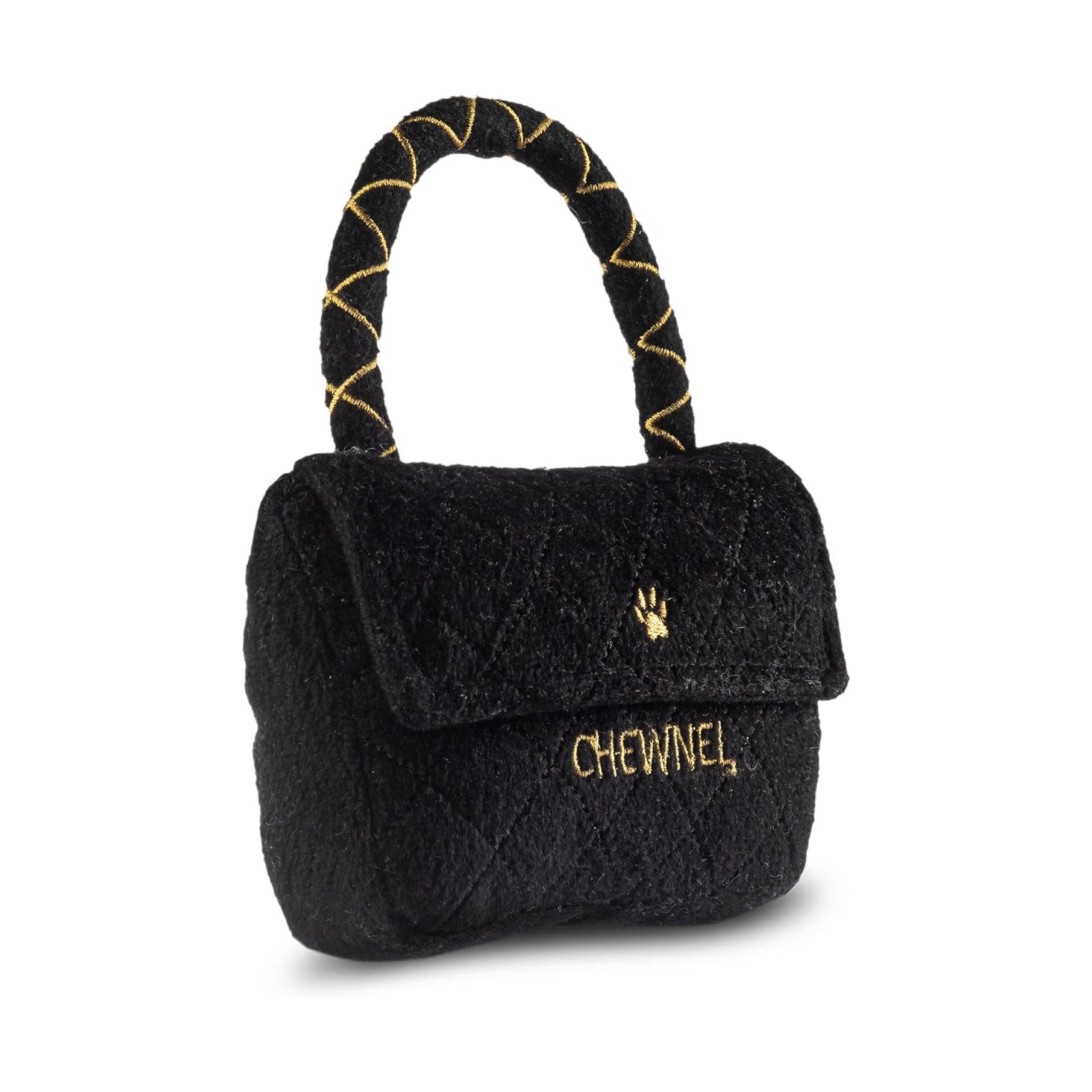 צעצוע פלאפי מצפצף בצורת תיק שחור, עם עיטורי רקמה והכיתוב "Chewnel" רקום בחוט מוזהב. ההומאז' המושלם לתיקי היוקרה המפורסמים של המותג הבינלאומי.