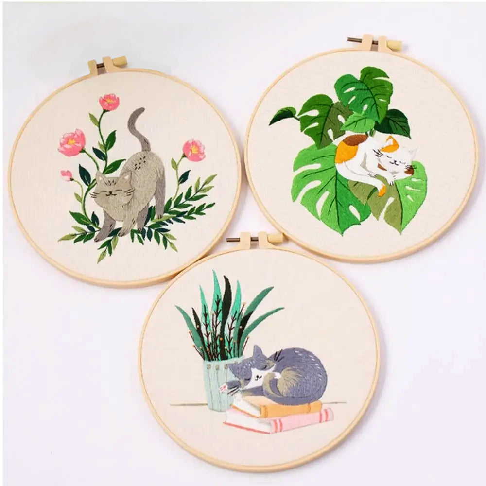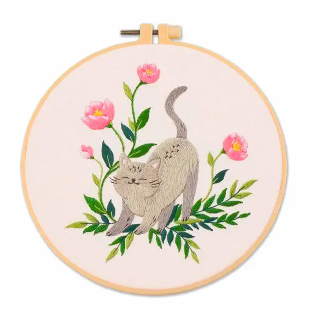 הערכה כוללת את כל מה שתצטרכו: בד רקמה איכותי עם ציור יפייפה של חתול ופרחים ורדרדים ועדינים, מחט ייעודית, חישוק מתיחה, חוטי רקמה צבעוניים.