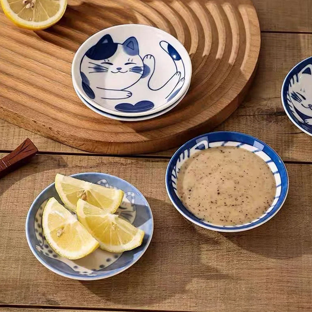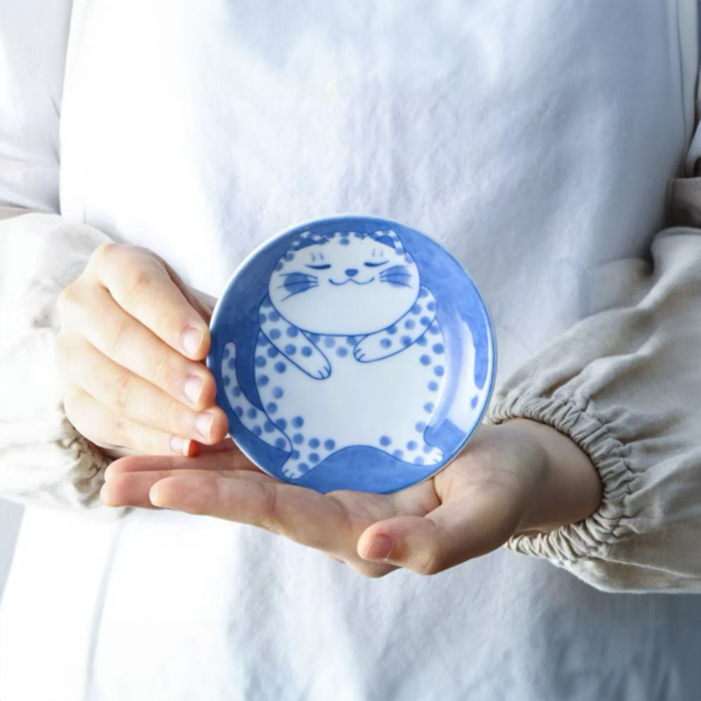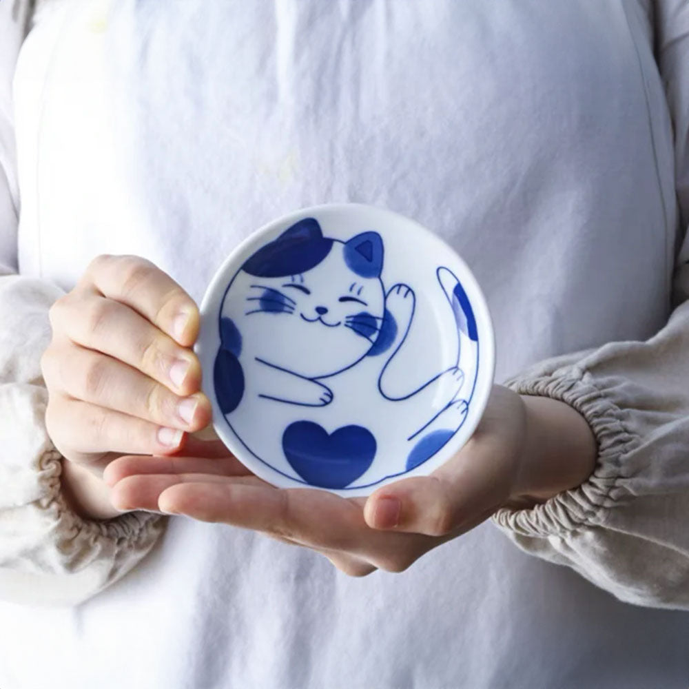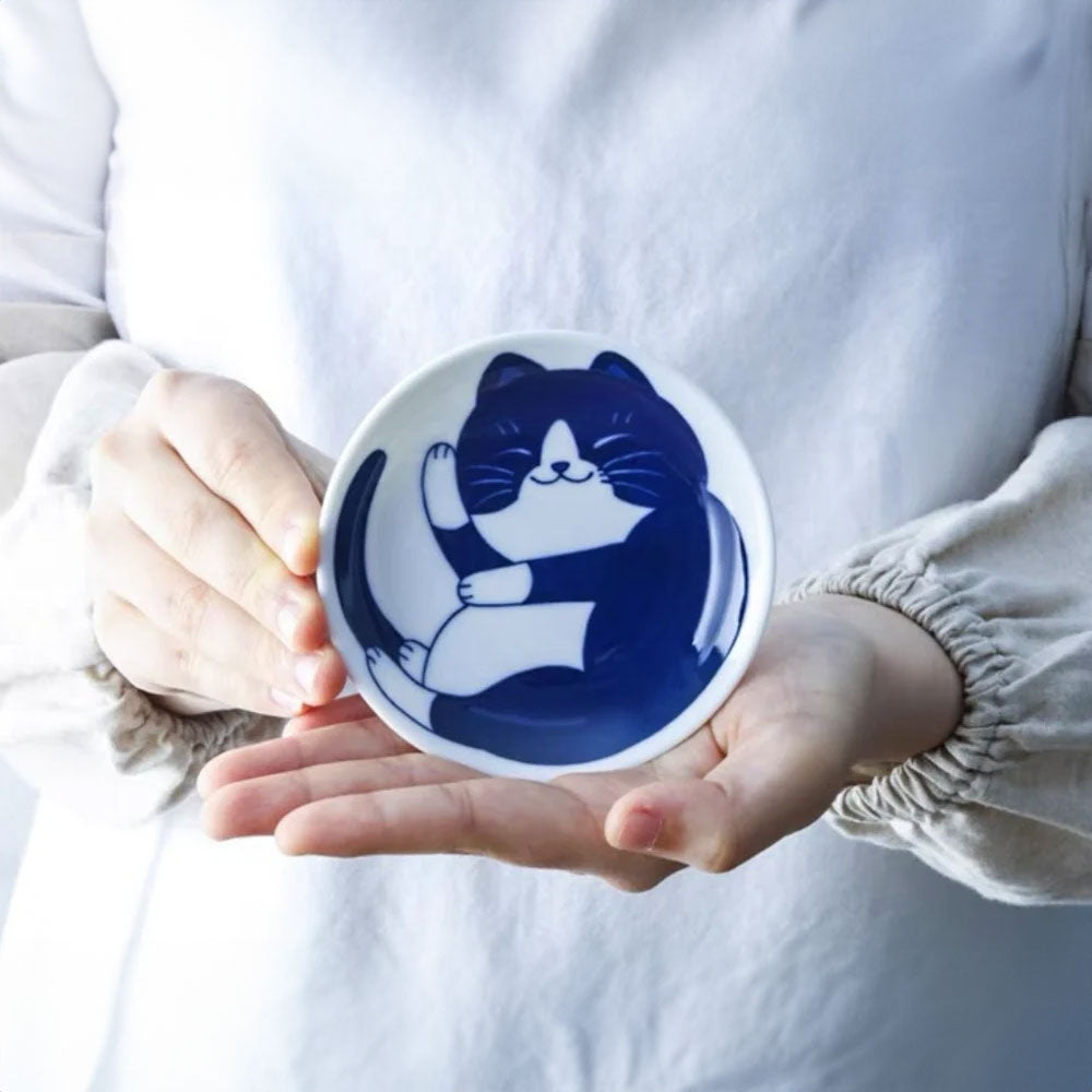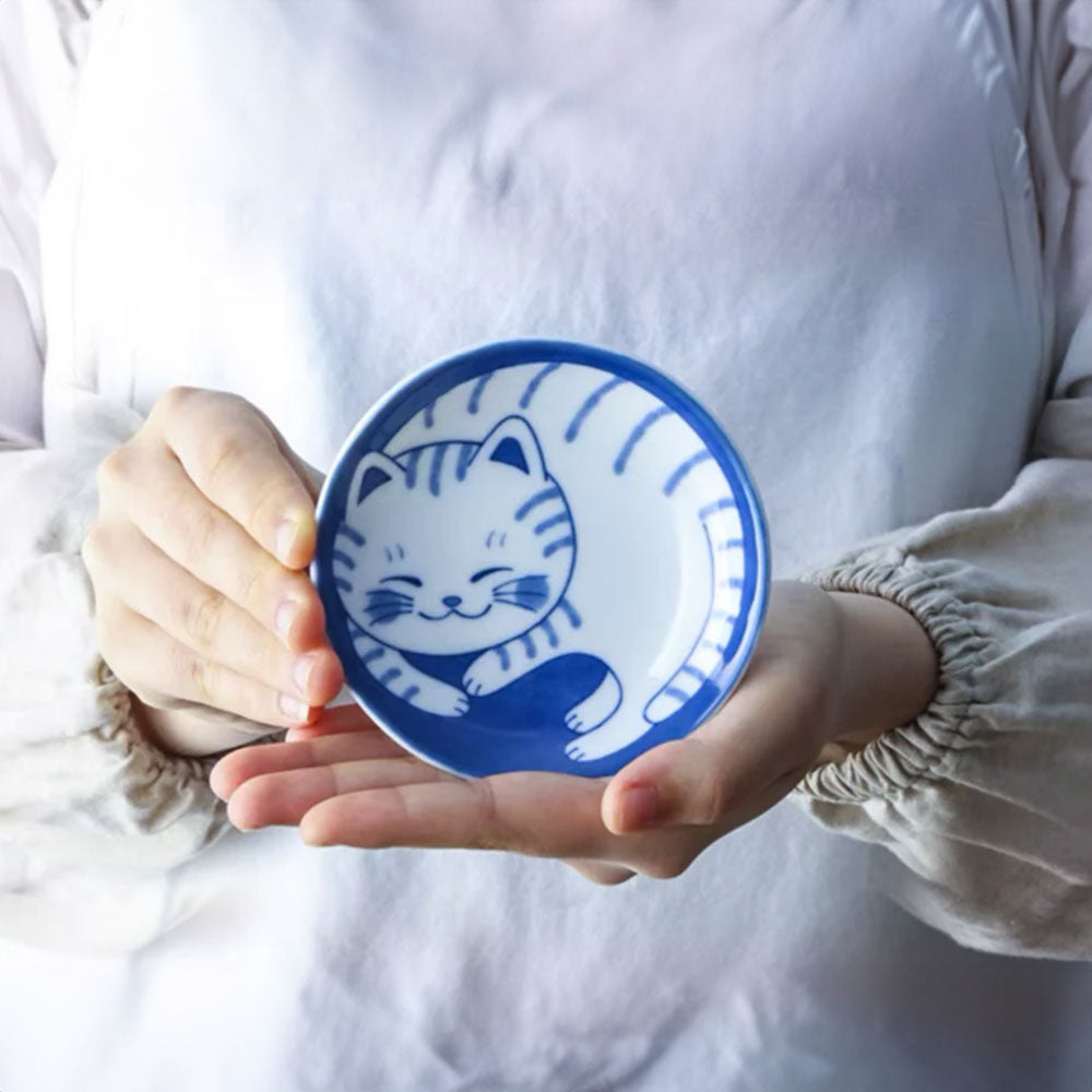 צלוחיות פורצלן איכותיות בעיצוב יפני, מעוטרות בציורי חתולים בגוני כחול. מגיע בארבע דוגמאות לבחירתכם.