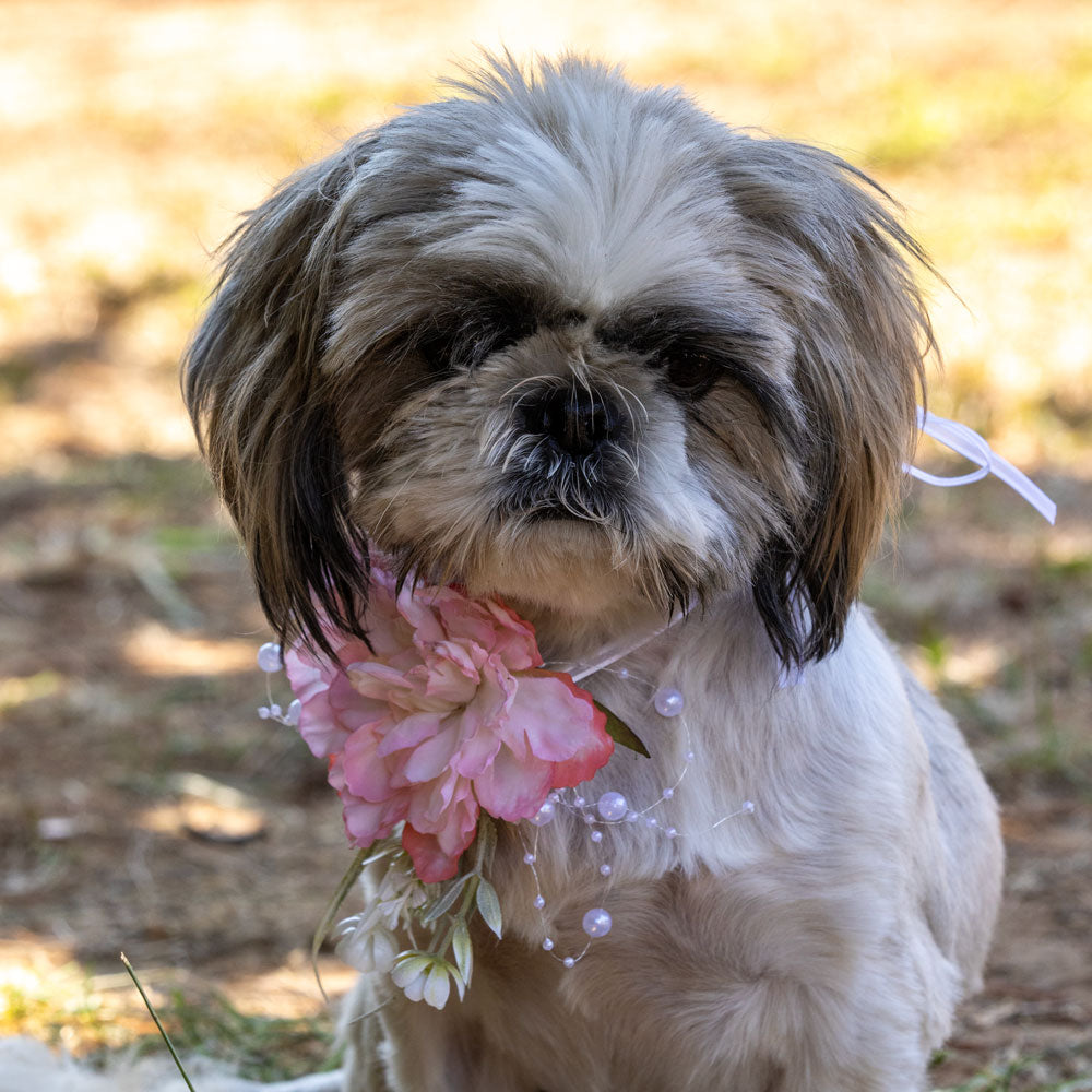 סרט קשירה לצוואר או לראש של חיית המחמד שלכם לאירוע מיוחד ויוקרתי. משלב זר פרחים עדין בסגנון רומנטי עם פרח ורוד, פרחים לבנים עדינים ופנינים זעירות נוצצות.
