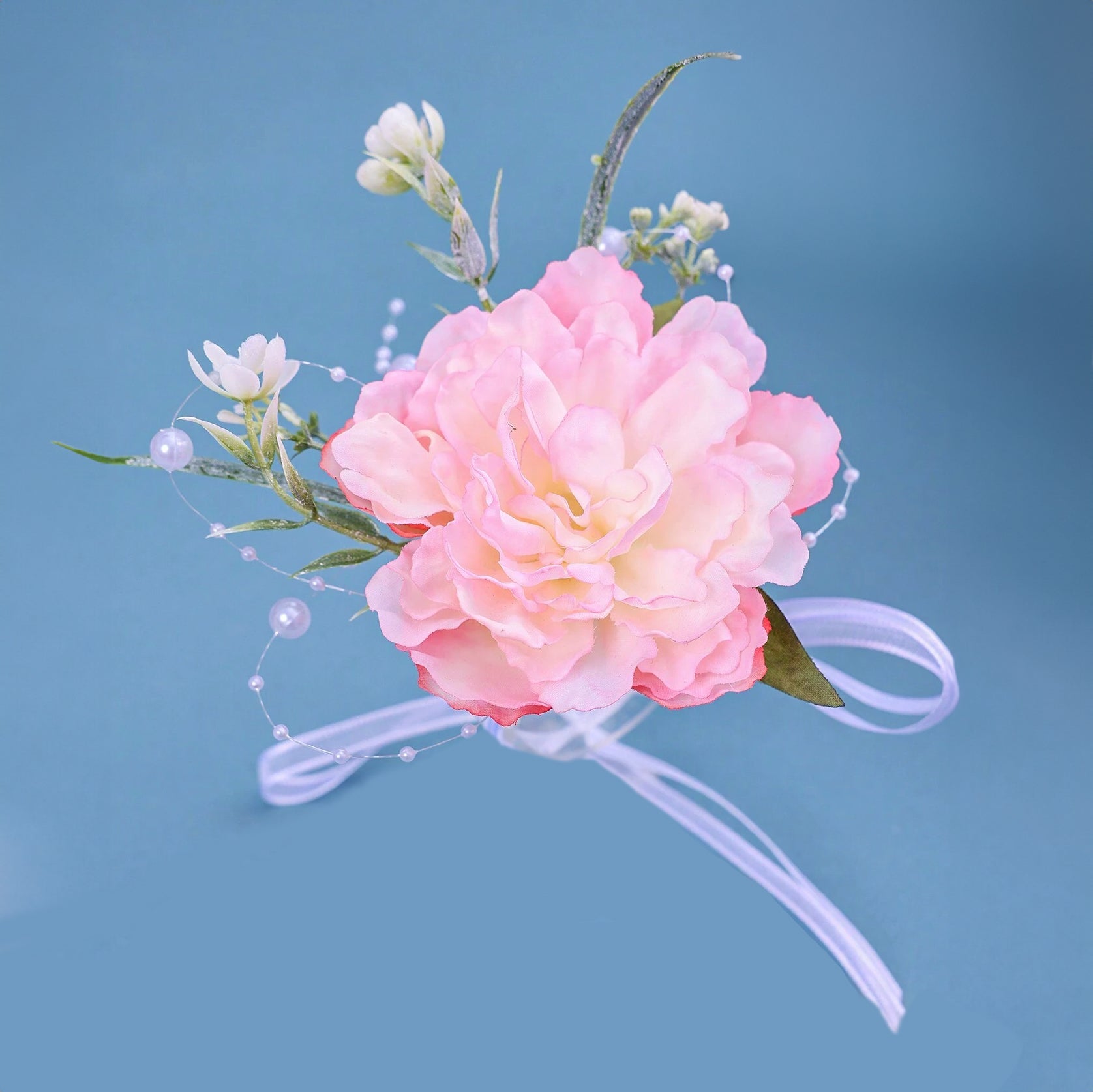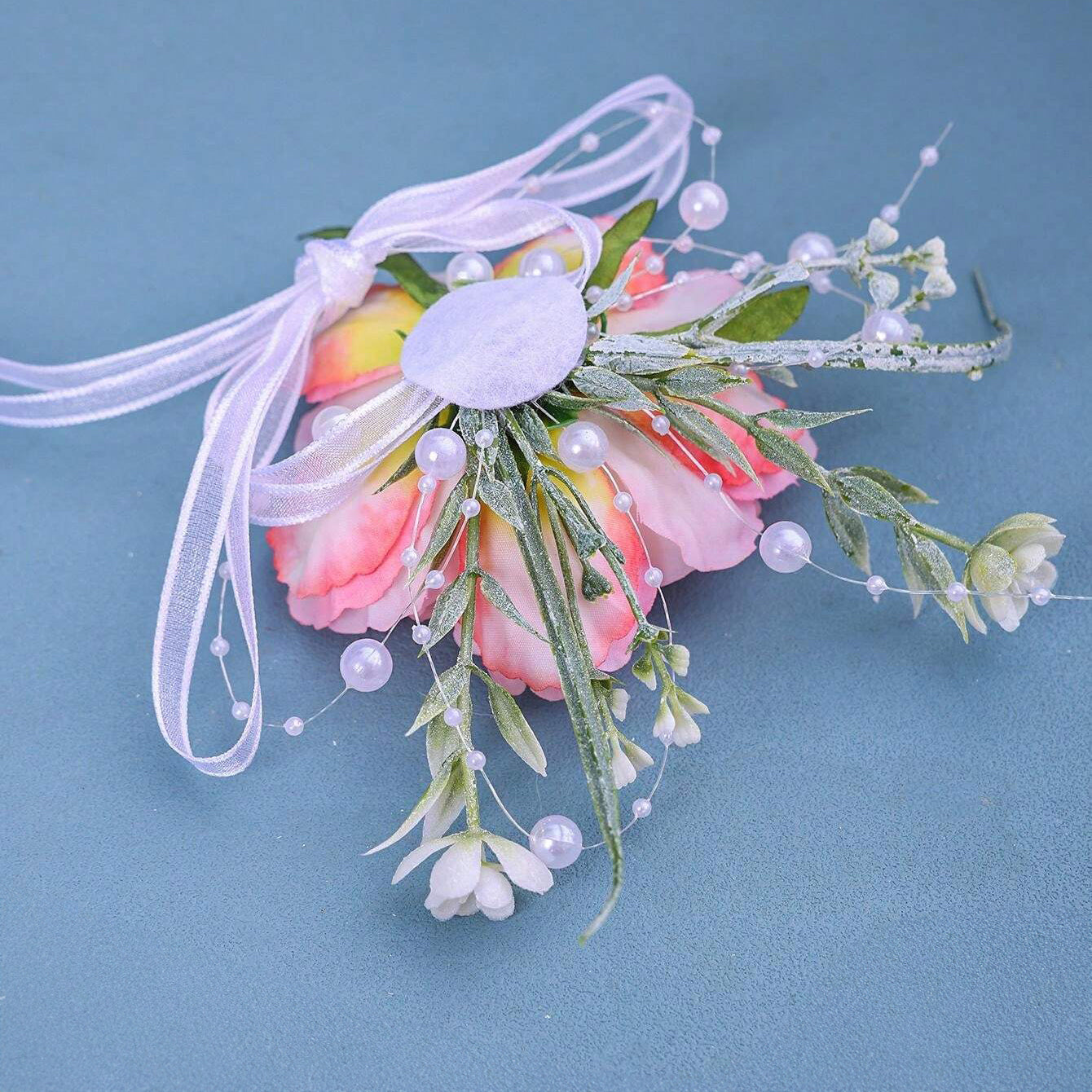 משולב בפרח ורוד במרכזו, מוקף בניצני פרחים לבנים עדינים ופנינים זעירות נוצצות, היוצרים מראה קסום ורומנטי.