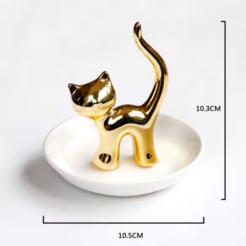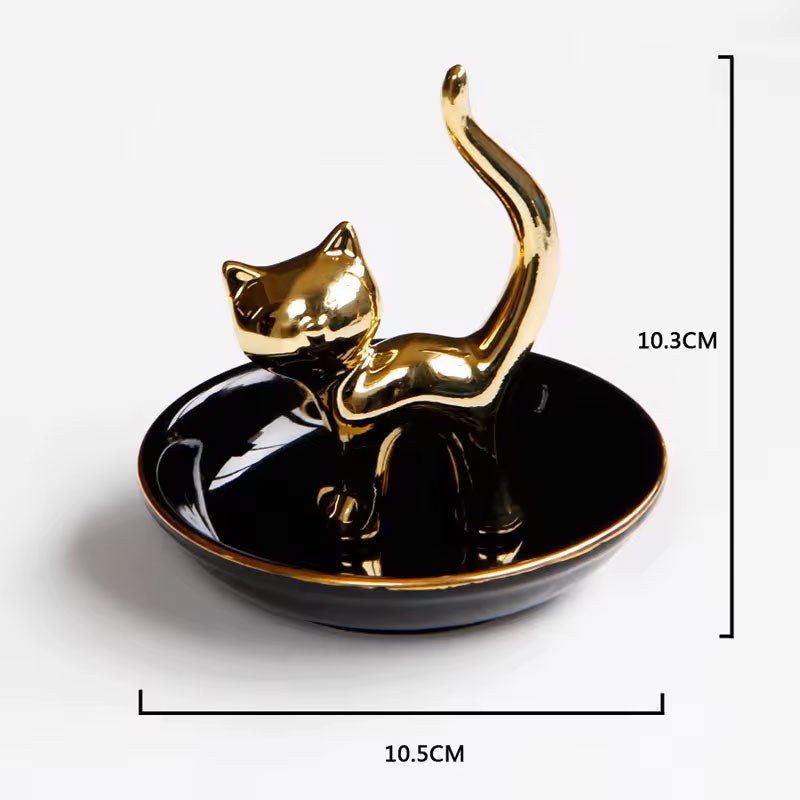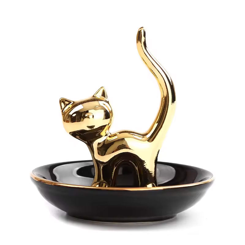 צלוחית לתכשיטים המשלבת אלגנטיות ושובבות. בסיס פורצלן מבריק עם חתול מוזהב שרק מחכה לשמור על האוצרות שלכם.