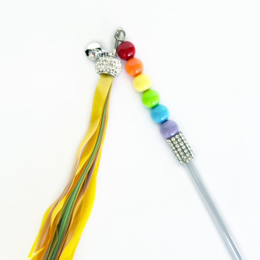 צעצוע חתולים שמשלב יופי ושעשוע במוצר אחד. שרביט צבעוני מעוטר בחרוזים דמוי יהלום, חרוזים בצבעי הקשת ופעמון קטן בסופו.