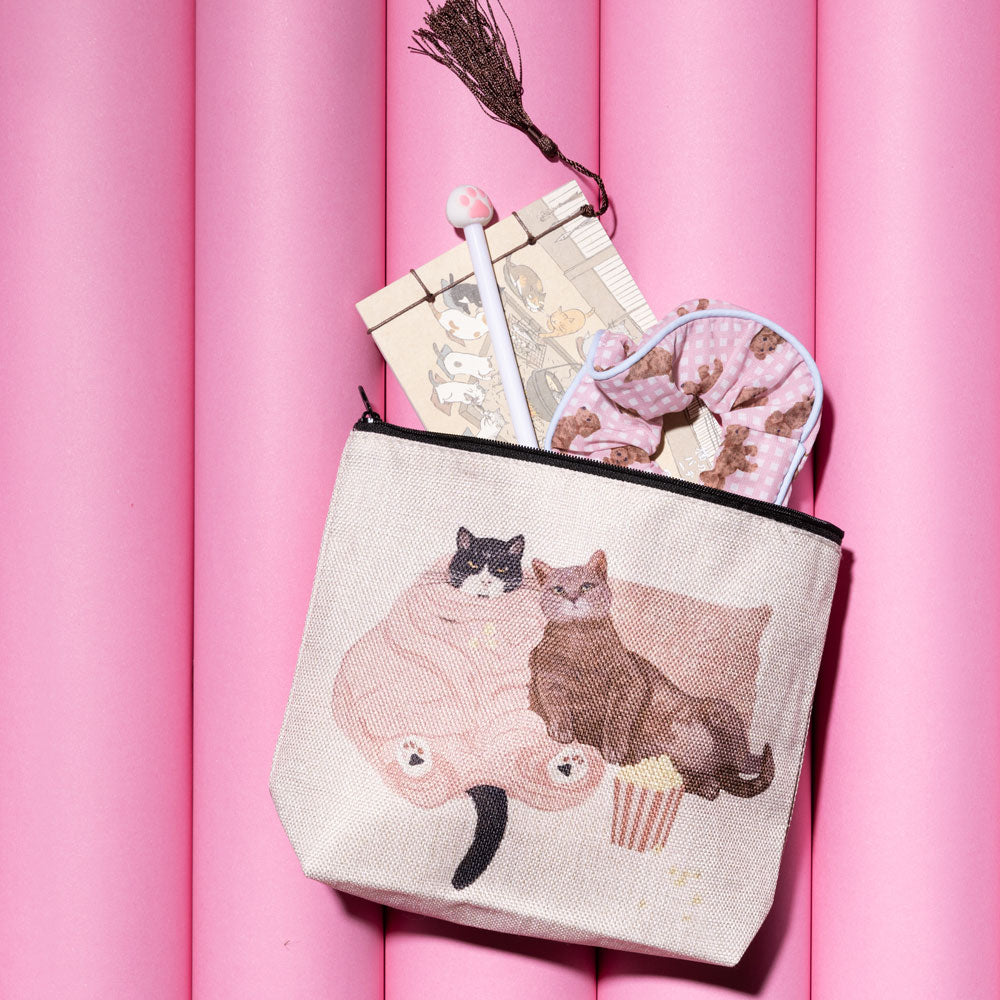 תיק איפור עם הדפס מקסים של שני חתולים מחובקים על הספה, נהנים מפופקורן ברוגע.