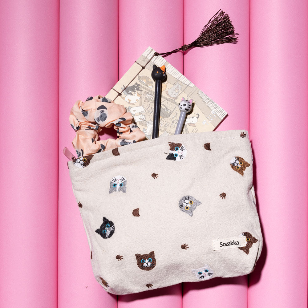 תיק איפור מבד קנבאס עם רקמה של פנים מתוקות של חתולים.