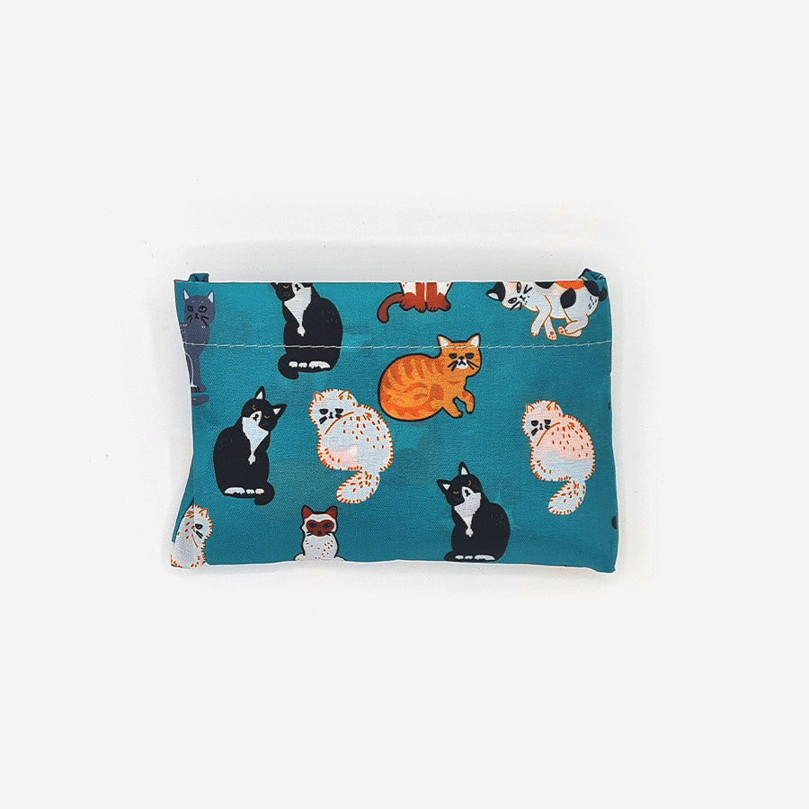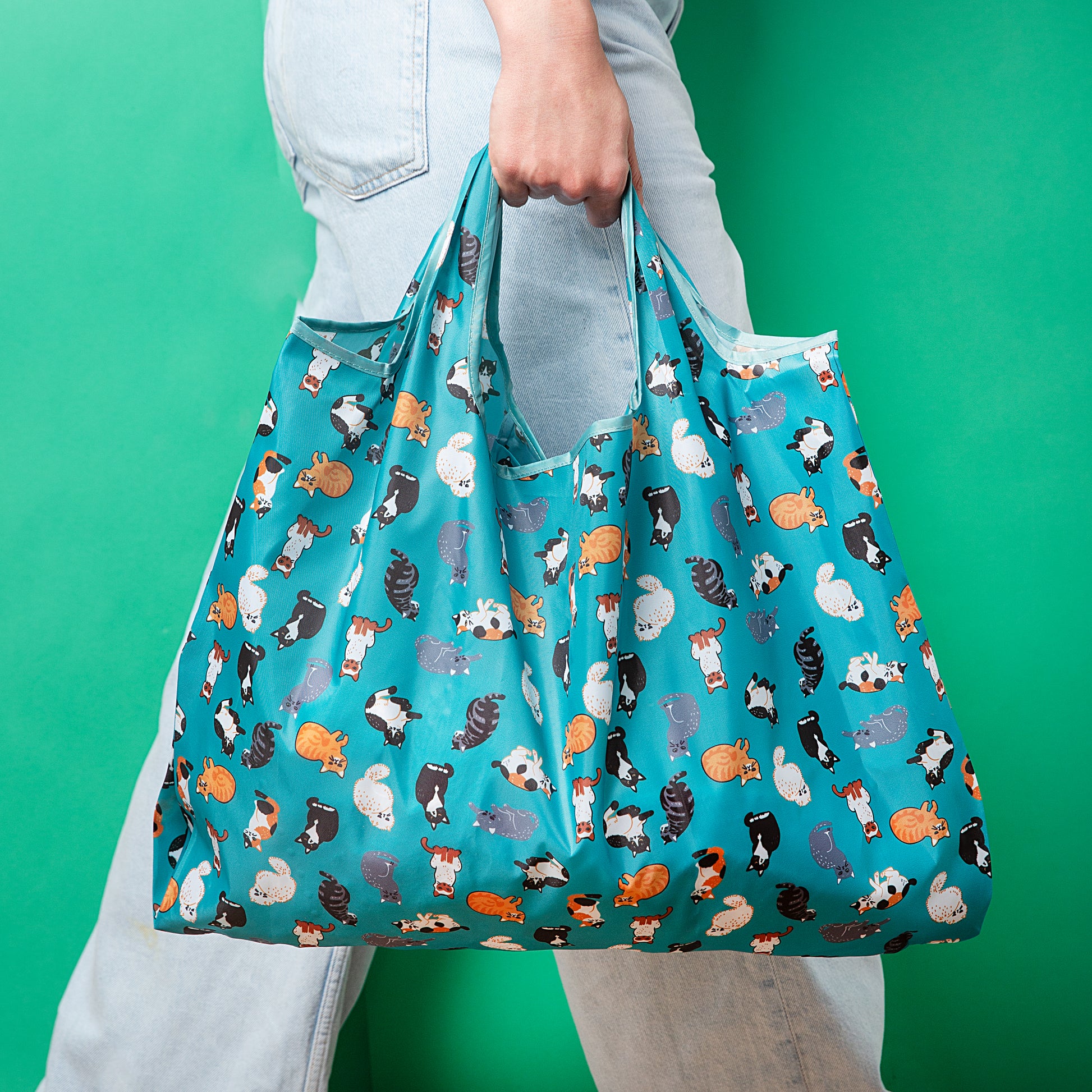 תיק קניות רב-פעמי עם איורי חתולים מתוקים על רקע ירוק. חזק, ומתקפל בקלות לתוך כיס קטן במוצר.