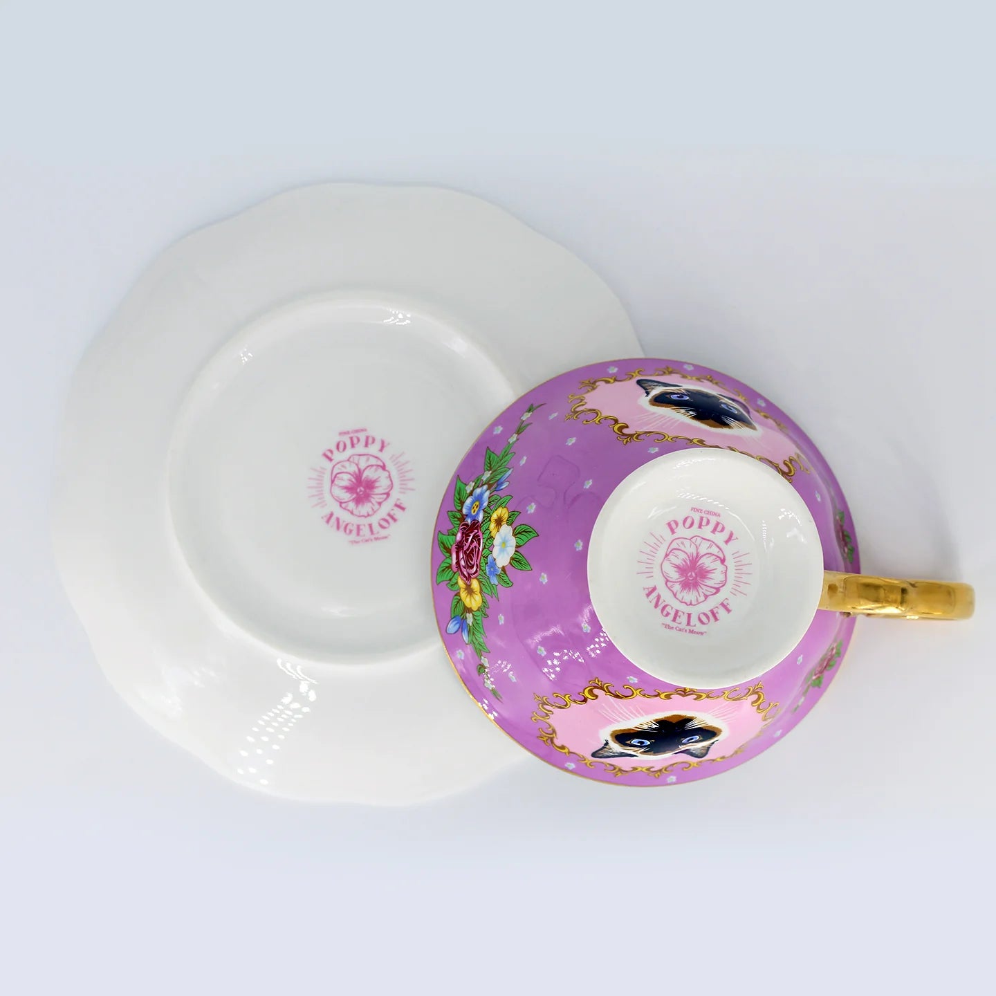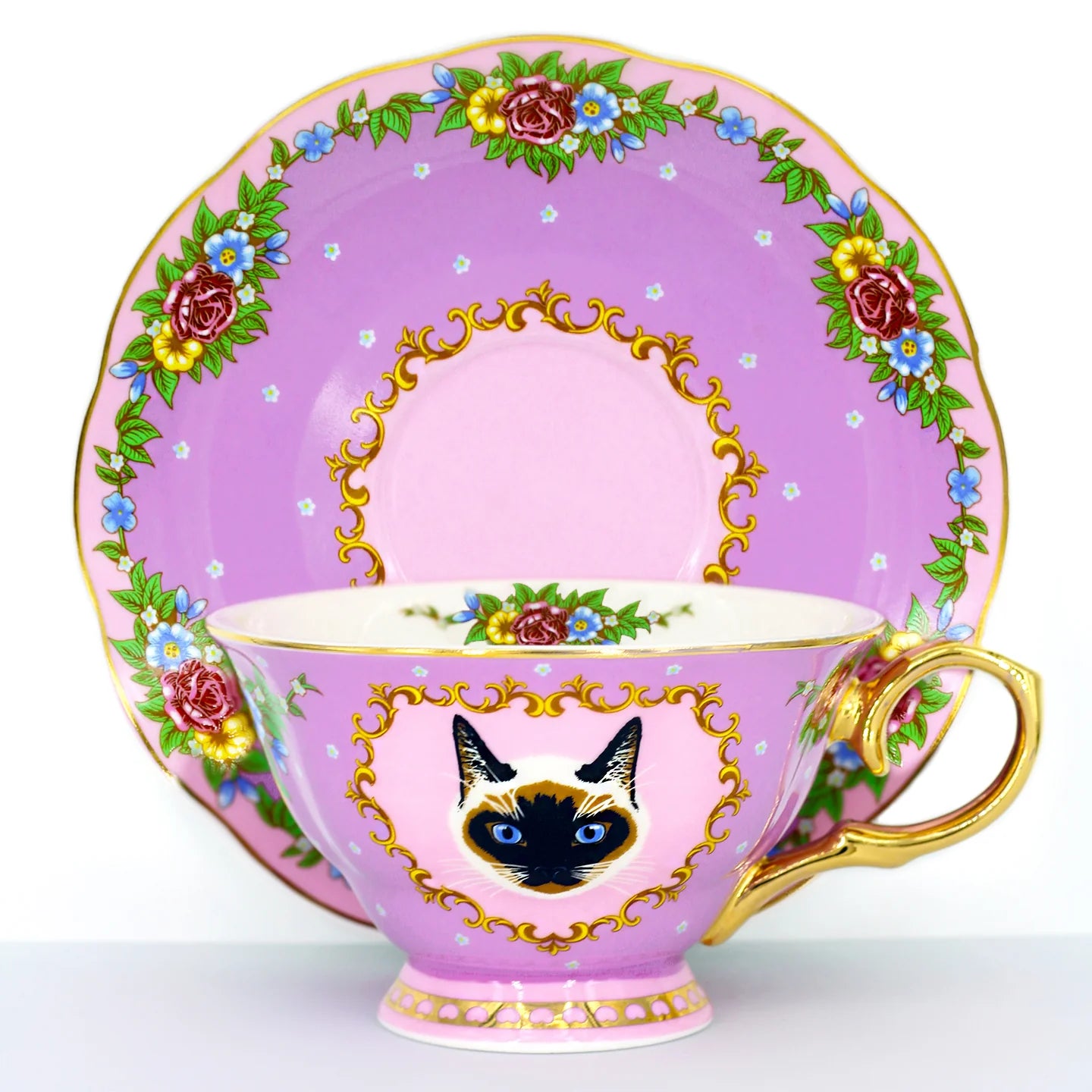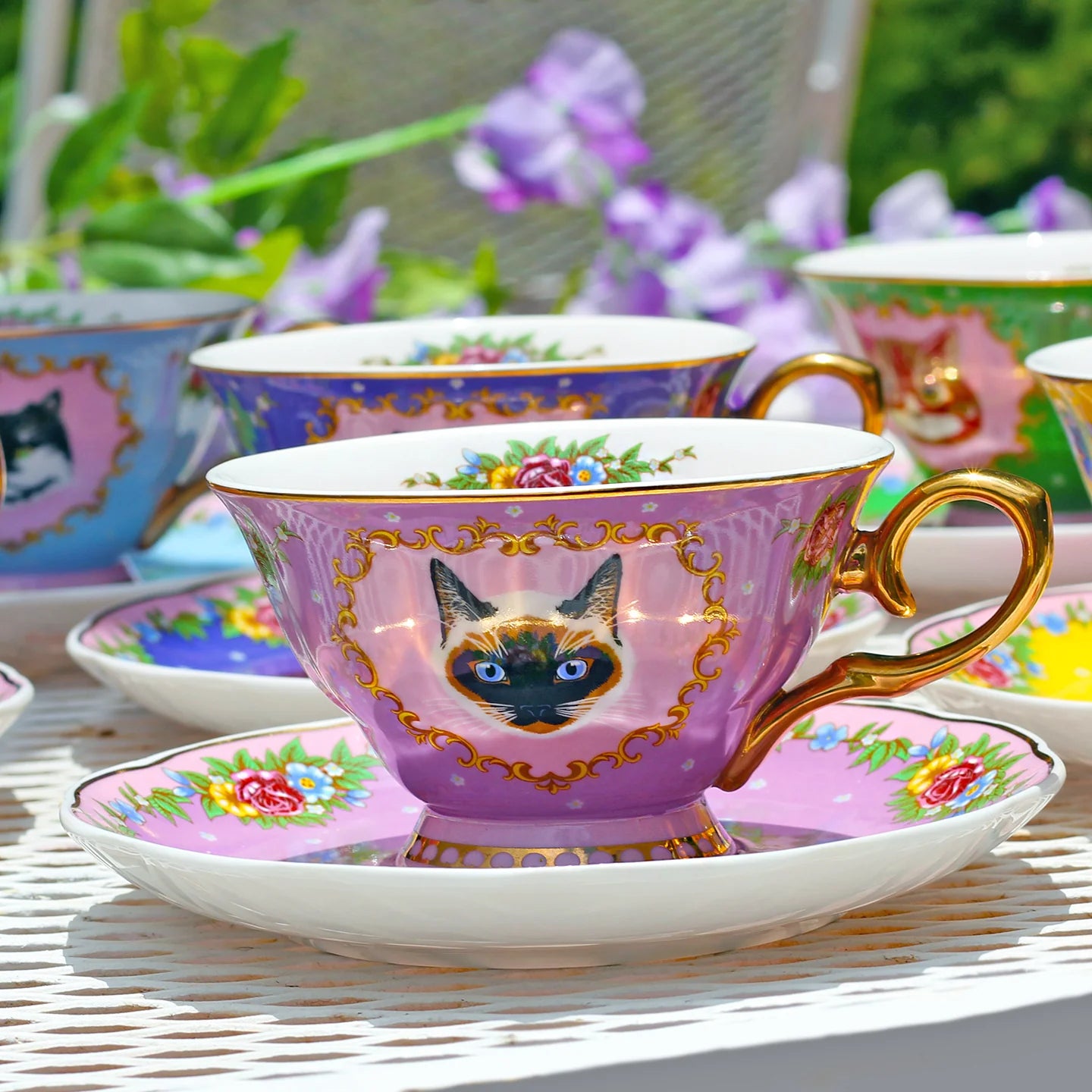מהדורה מוגבלת! סט מלכותי של כוס וצלחת פורצלן עליהם מופיע סיאמי פרוותי. העיצוב משלב רקע בגוון סגלגל, זרי פרחים צבעוניים ועלים ירוקים, ומעוטר בזהב אמיתי 24K. כל כך יפה שמתאים לא רק לשתיה אלא גם כאקססורי לבית. כל סט מגיע בקופסא מהודרת.