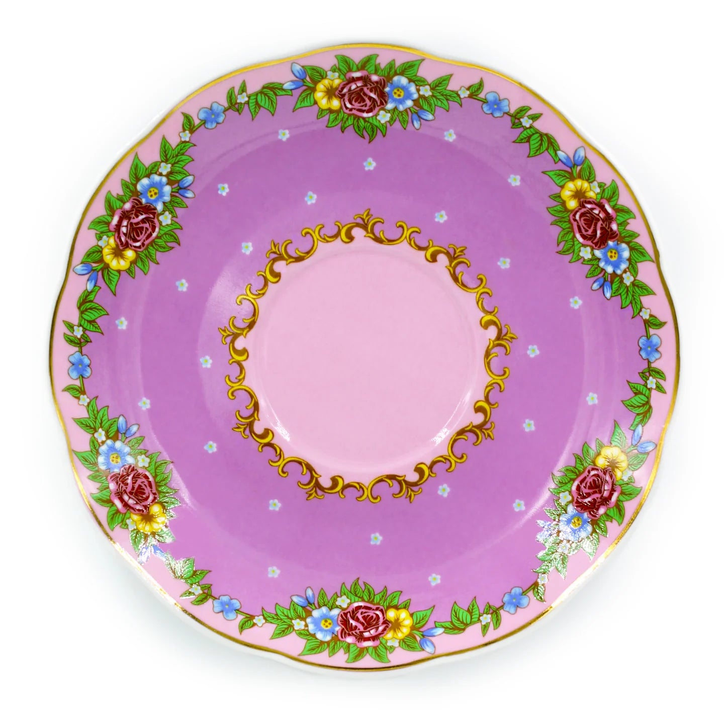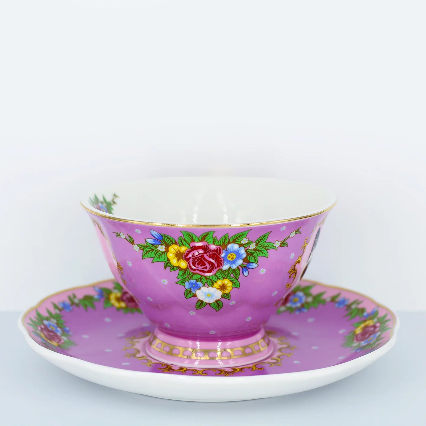 סט מושקע של צלחת וכוס פורצלן עם איור מקסים של סיאמי פרוותי. העיצוב משלב רקע בגוון סגלגל, זרי פרחים צבעוניים ועלים ירוקים - הכל מצויר ביד בצבעים עזים ומעוטר בזהב אמיתי 24K.