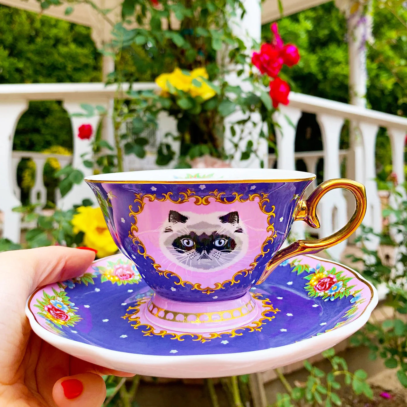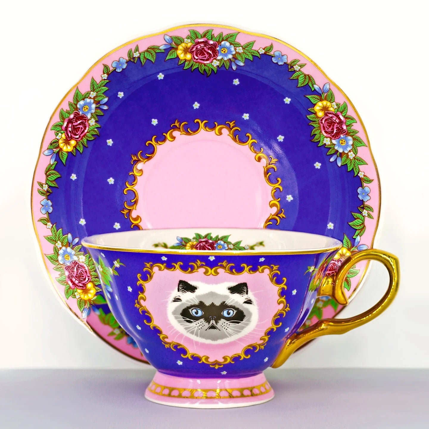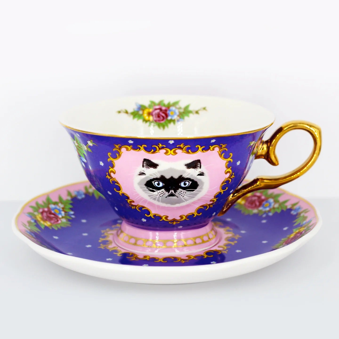 סט מושקע של צלחת וכוס פורצלן עם איור מקסים של חתול מפואר מגזע הימלאיה. העיצוב משלב רקע בגוון כחול, זרי פרחים צבעוניים ועלים ירוקים - הכל מצויר ביד בצבעים עזים ומעוטר בזהב אמיתי 24K.