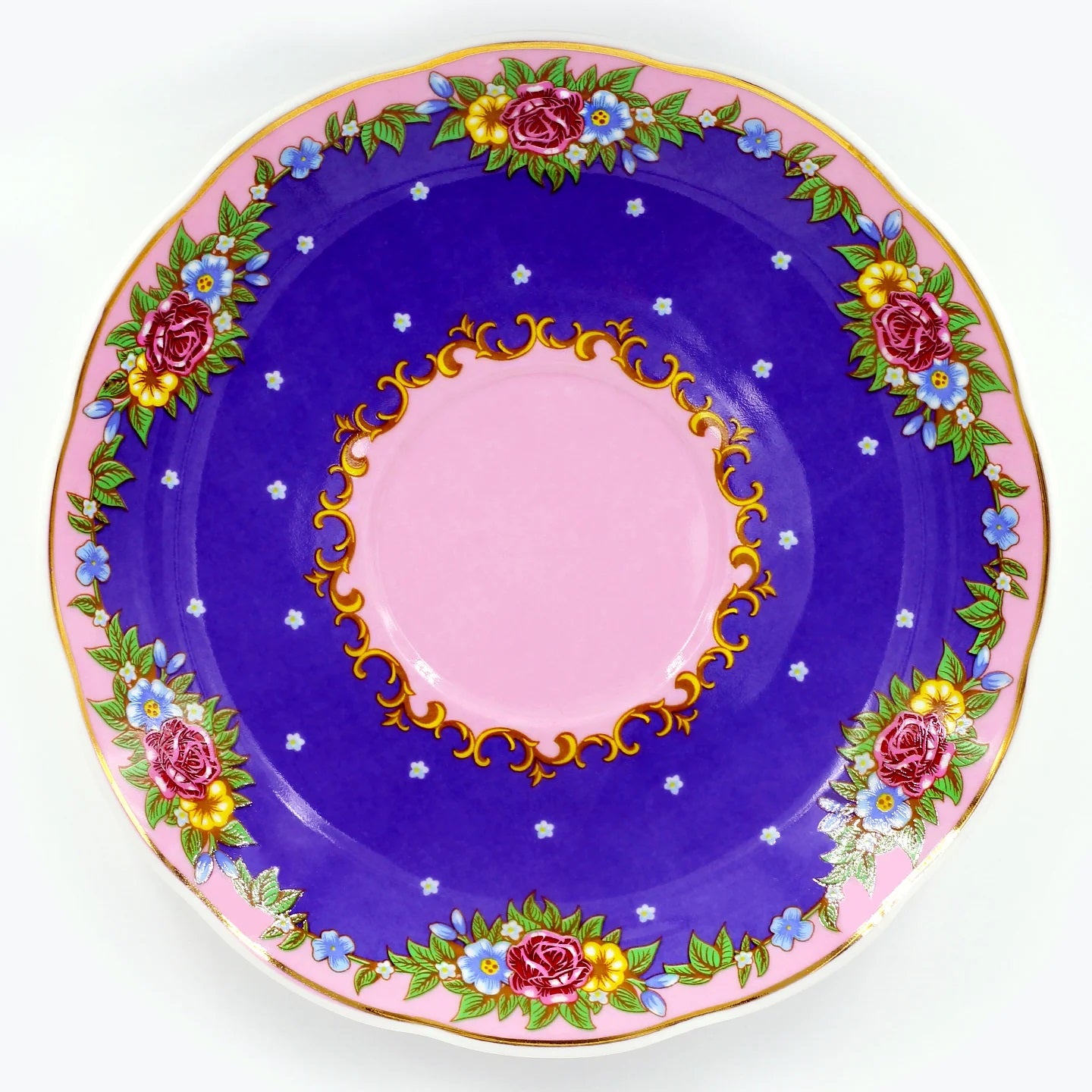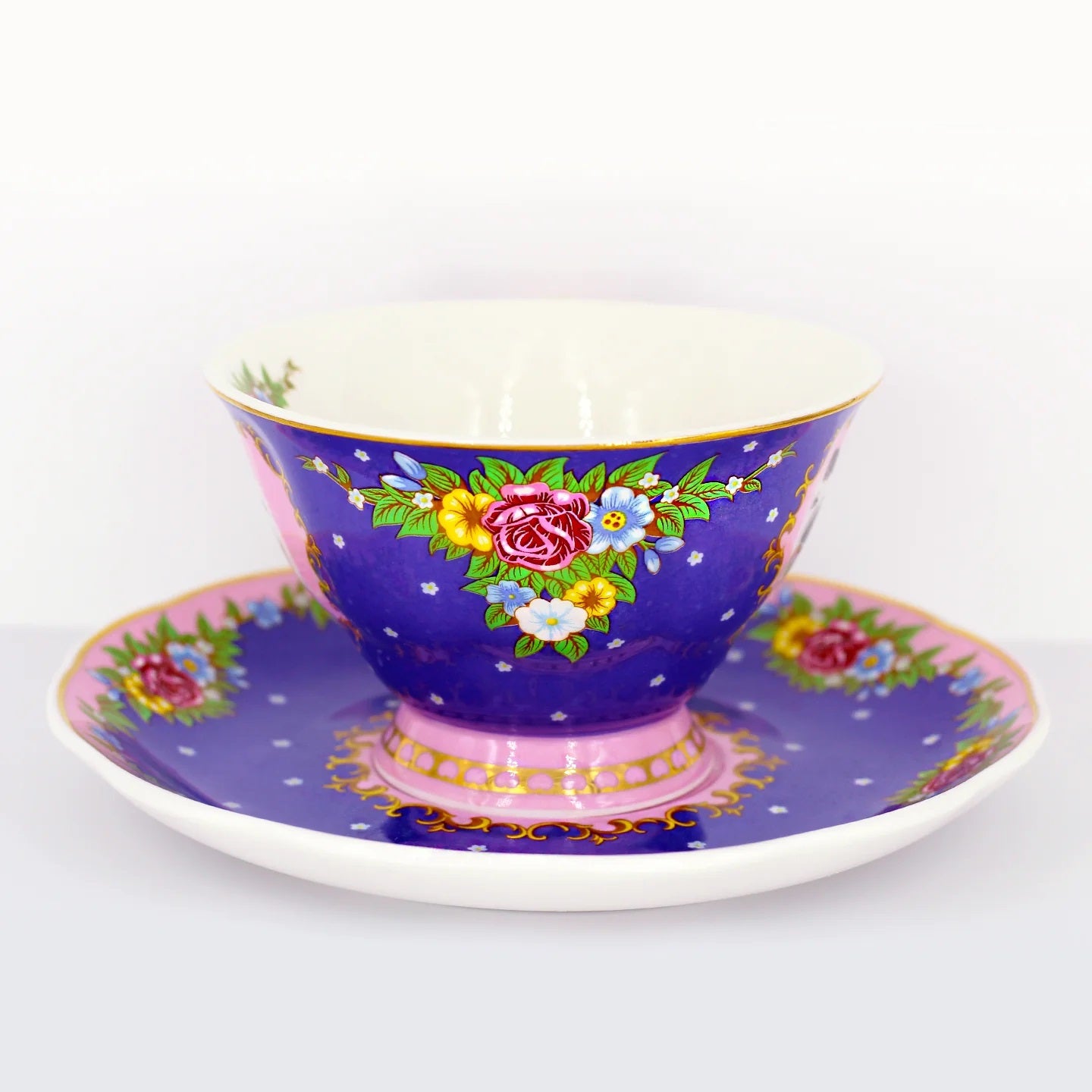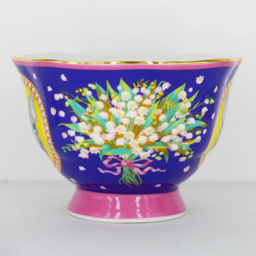 סט מושקע של צלחת וכוס פורצלן עם איור מקסים של חתול מפואר מגזע הימלאיה. העיצוב משלב רקע בגוון כחול, זרי פרחים צבעוניים ועלים ירוקים - הכל מצויר ביד בצבעים עזים ומעוטר בזהב אמיתי 24K.